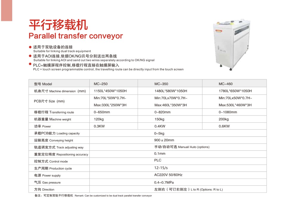 SMT周邊設備主要有:全自動PCB上下料機、平行移載機、PCB儲板機、NG/OK緩存機、接駁臺、光板真空上料機、翻板輸送機等小型機。