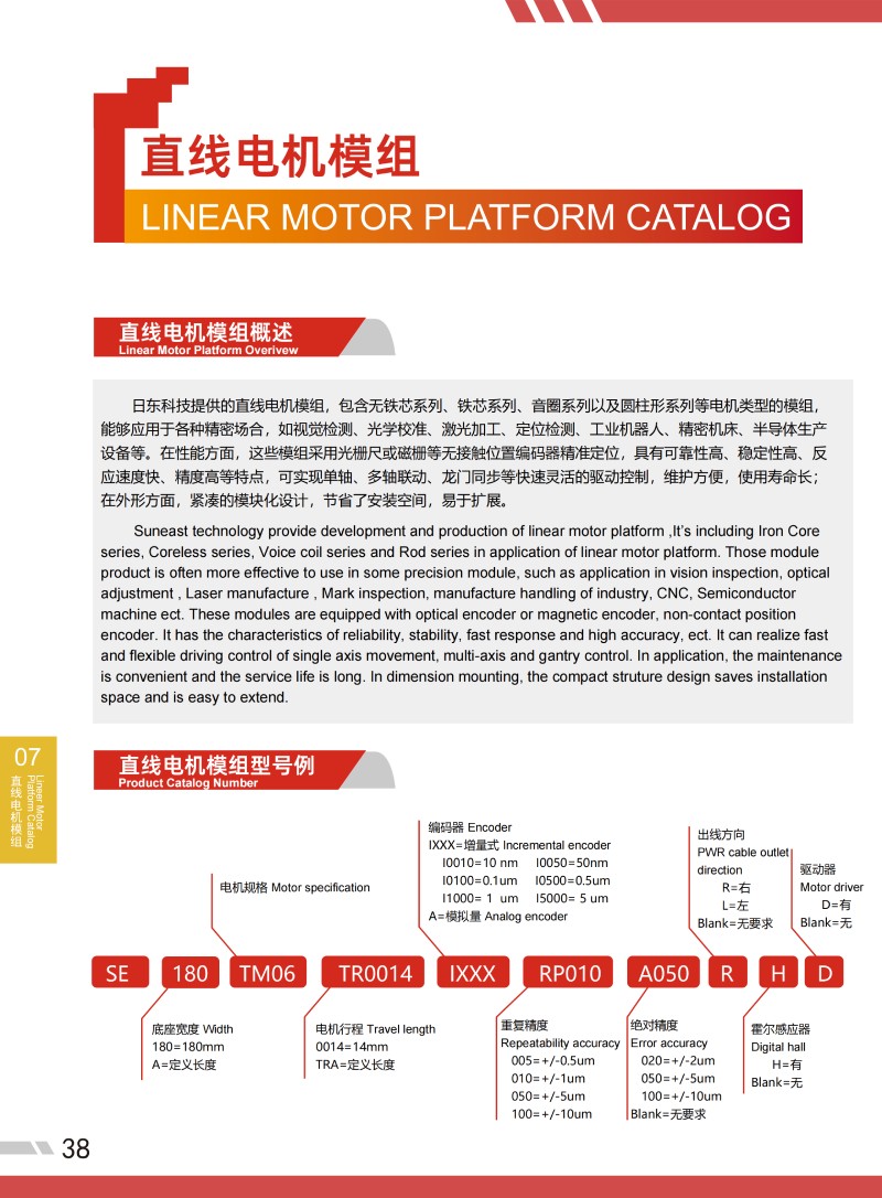 日東科技提供的直線電機(jī)模組,包含無鐵芯系列、鐵芯系列、音圈系列以及圓柱形系列等電機(jī)類型的模組,能夠應(yīng)用于各種精密場合,如視覺檢測、光學(xué)校準(zhǔn)、激光加工、定位檢測、工業(yè)機(jī)器人、精密機(jī)床、半導(dǎo)體生產(chǎn)設(shè)備等。在性能方面,這些模組采用光柵尺或磁柵等無接觸位置編碼器精準(zhǔn)定位,具有可靠性高、穩(wěn)定性高、反應(yīng)速度快、精度高等特點(diǎn),可實(shí)現(xiàn)單軸、多軸聯(lián)動、龍門同步等快速靈活的驅(qū)動控制,維護(hù)方便,使用壽命長;在外形方面,緊湊的模塊化設(shè)計(jì),節(jié)省了安裝空間,易于擴(kuò)展。