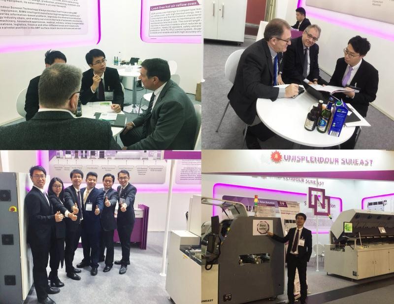 2017年11月14日至17日,Productronica2017在德國慕尼黑新國際博覽中心舉行。日東科技攜選擇性波峰焊SUNFLOW3、無鉛回流焊SER706A、全自動錫膏印刷機SL120亮相Productronica2017展。