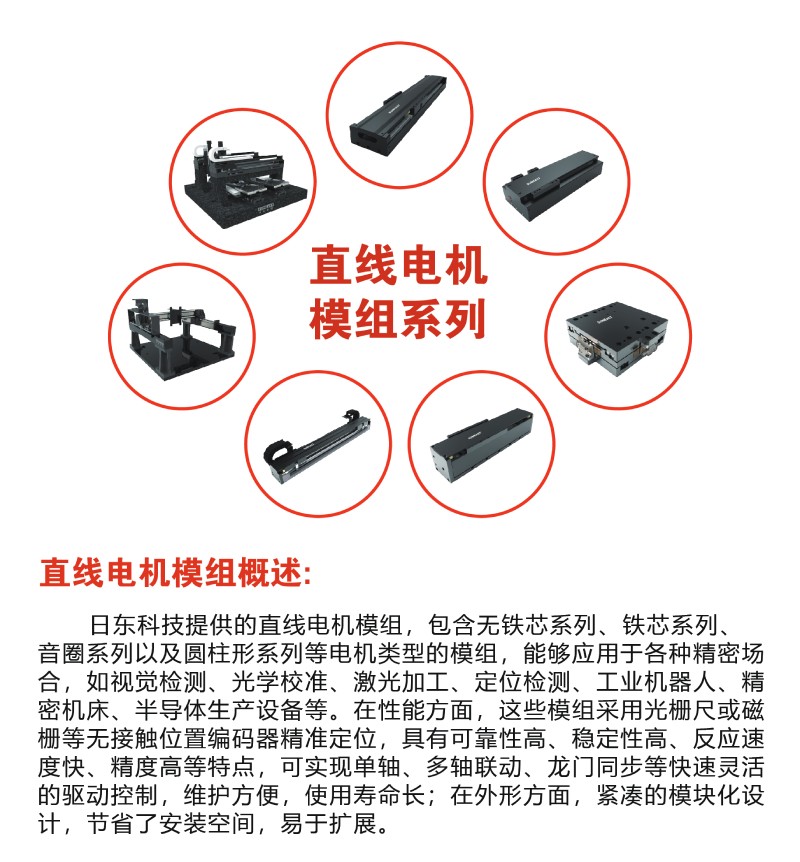 日東科技自主研發的直線電機產品系列,集高精度(100納米重復定位精度)、高響應速度、高穩定性及可靠性等優點,廣泛應用于各行業精密場合,如視覺檢測、光學校準對位、激光加工、工業機器人、精密機床等。產品采用光柵尺或磁柵等無接觸位置編碼器精準定位,可實現單軸、多軸聯動,龍門同步等快速靈活的驅動控制,維護方便,使用壽命長,同時緊湊的模塊化設計節省了安裝空間,易于擴展。