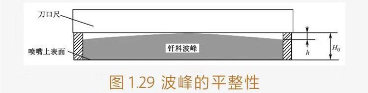 ?、蹨y試方法:利用刀口尺橫架在整個波峰闊度上并保持與波峰噴嘴的上表面平行。微調(diào)波峰高度使其最高點剛好與刀口尺的刀刃相接觸,觀測其沿整個闊度方向的最高點和最低點的高度差h,其值應不大于10%H0。