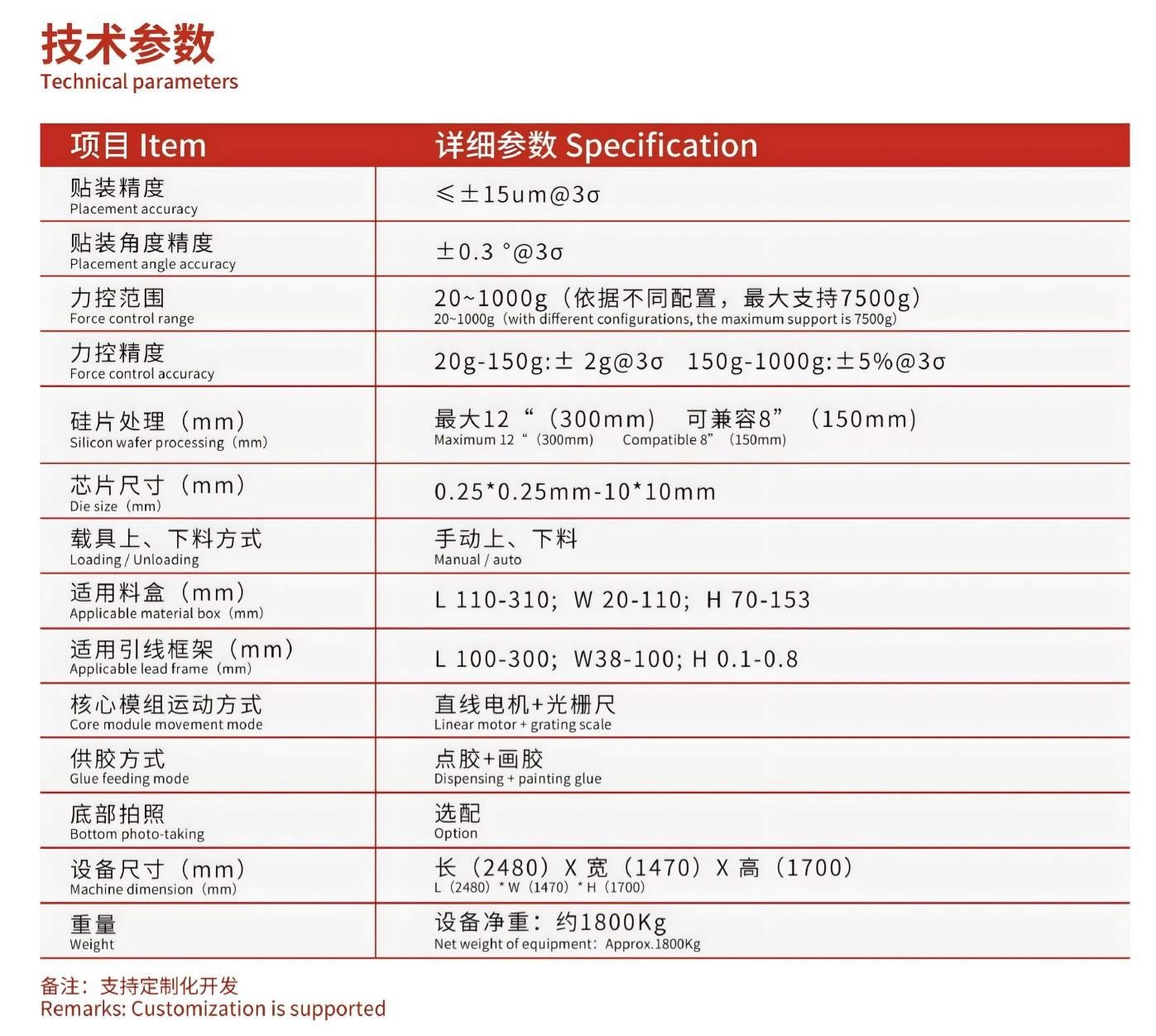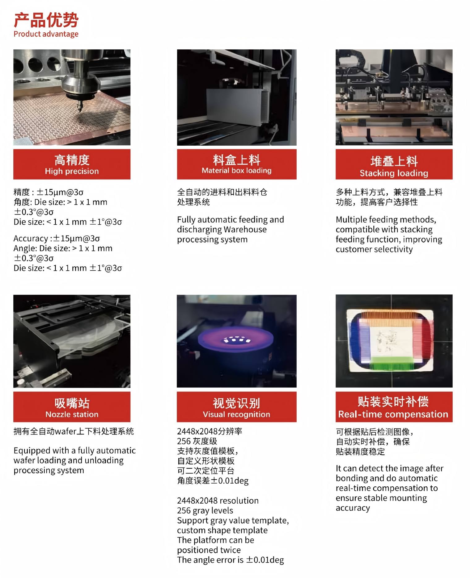 通用型高精度芯片貼合機,應對大批量wafer上料的貼裝產(chǎn)品,適用于SIP封裝、Memory Stack Die(存儲芯片堆疊)、CMOS 、MEMS等工藝。
