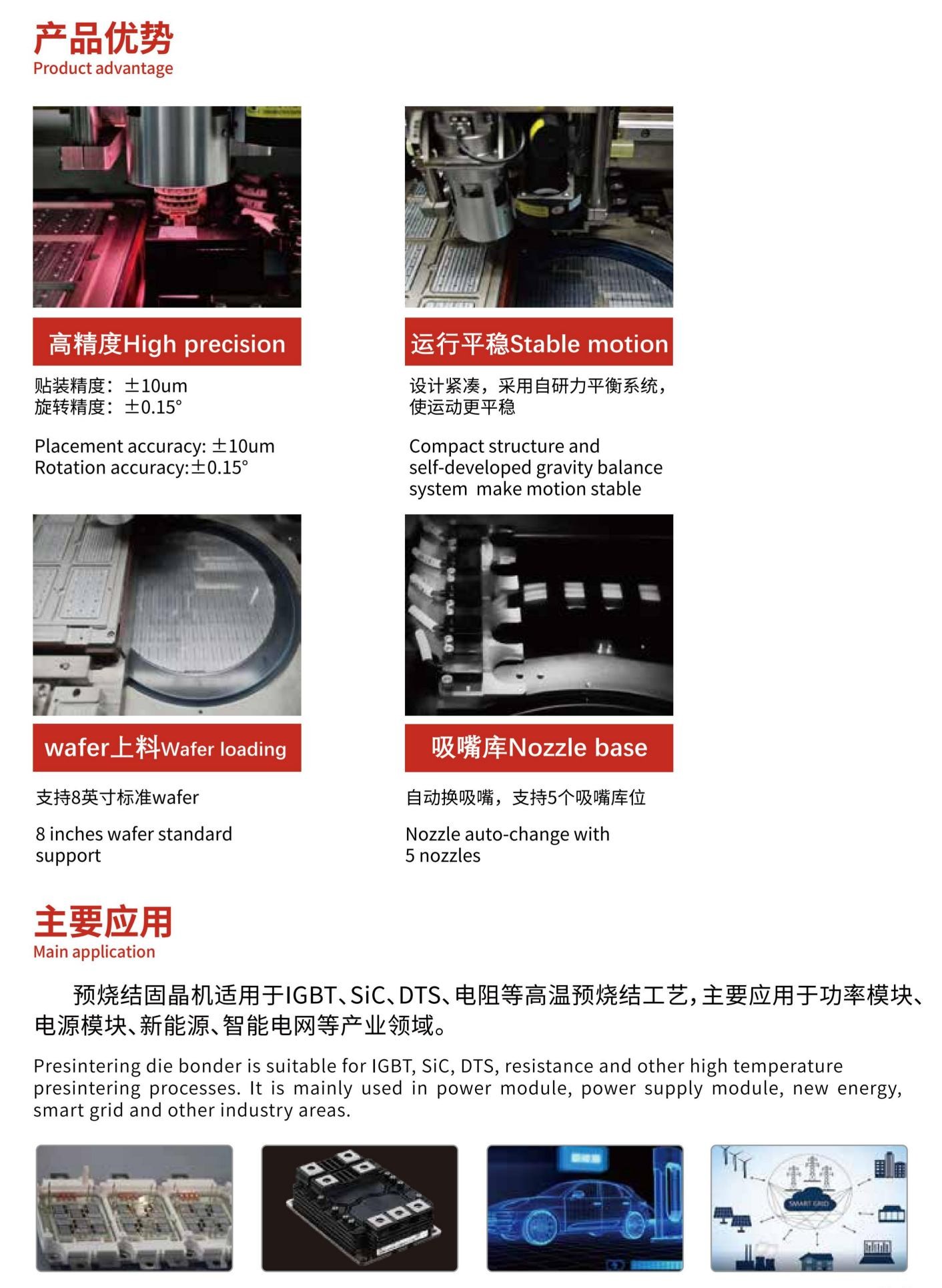預(yù)燒結(jié)貼合機(jī)面向功率半導(dǎo)體芯片貼裝市場,配備功能更加強(qiáng)大的BONDHEAD系統(tǒng),除了高精度貼合功能外,還具備保壓、加熱功能。配合高精度的加熱系統(tǒng),實(shí)現(xiàn)電子元器件的預(yù)燒結(jié)貼合。