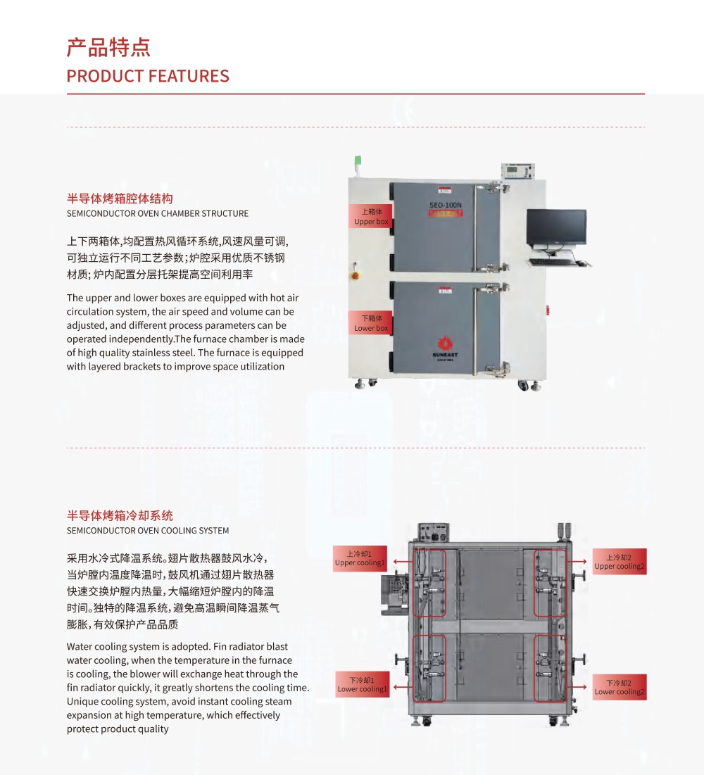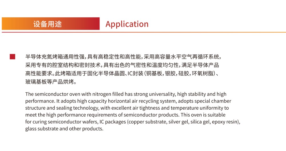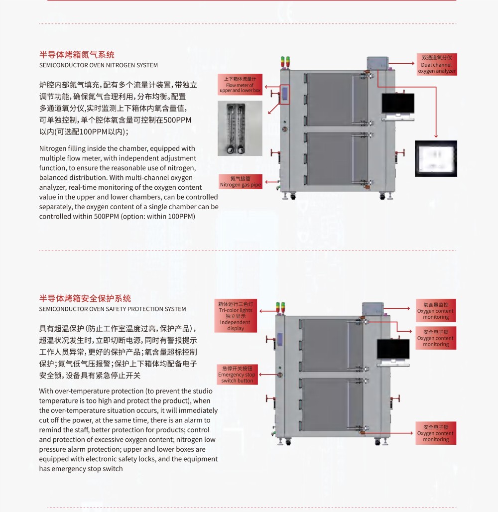 半導體充氮烤箱通用性強,具有高穩定性和高性能,采用高容量水平空氣再循環系統,采用專有的腔室結構和密封技術,具有出色的氣密性和溫度均勻性,滿足半導體產品高性能要求。此烤箱適用于固化半導體晶圓、IC封裝(銅基板,銀膠,硅膠,環氧樹脂)、玻璃基板等產品烘烤。