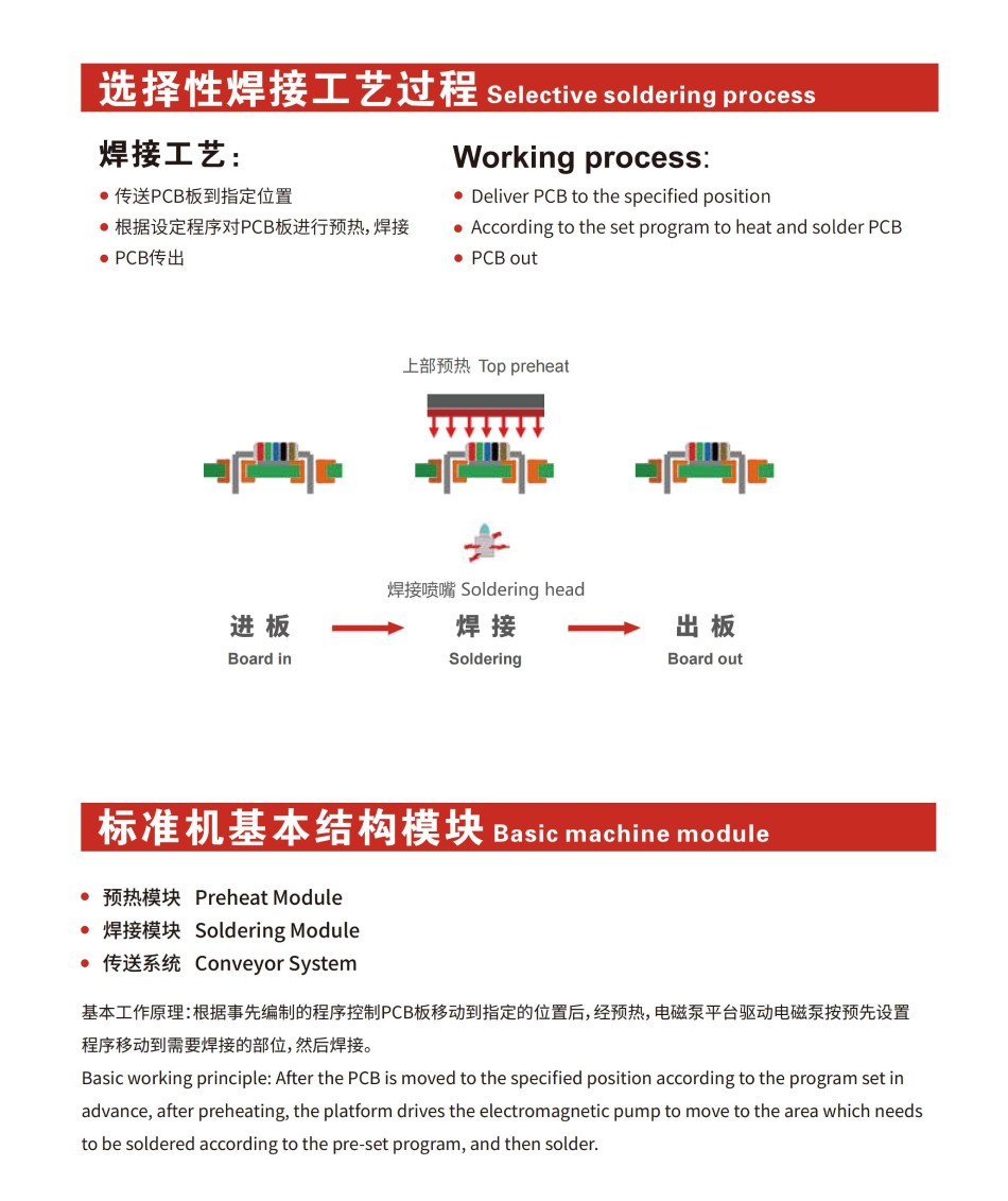 基本工作原理:根據事先編制的程序控制PCB板移動到指定的位置后,經預熱,電磁泵平臺驅動電磁泵按預先設置程序移動到需要焊接的部位,然后焊接。