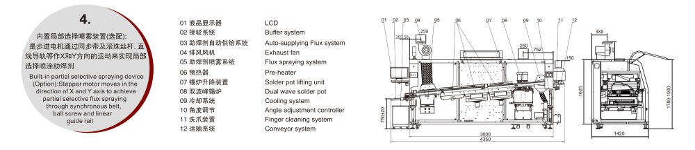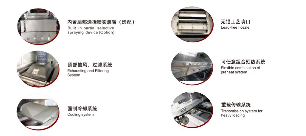 預熱系統:優化微熱風循環路徑,溫區內溫度更均勻穩定;噴霧抽風系統:采用全新理念,分體式設計,維護保養,方便快捷;內置局部選擇噴霧裝置(選配):是步進電機通過同步帶及滾珠絲桿,直線導軌等作X和Y方向的運動來實現局部選擇噴涂助焊劑。
