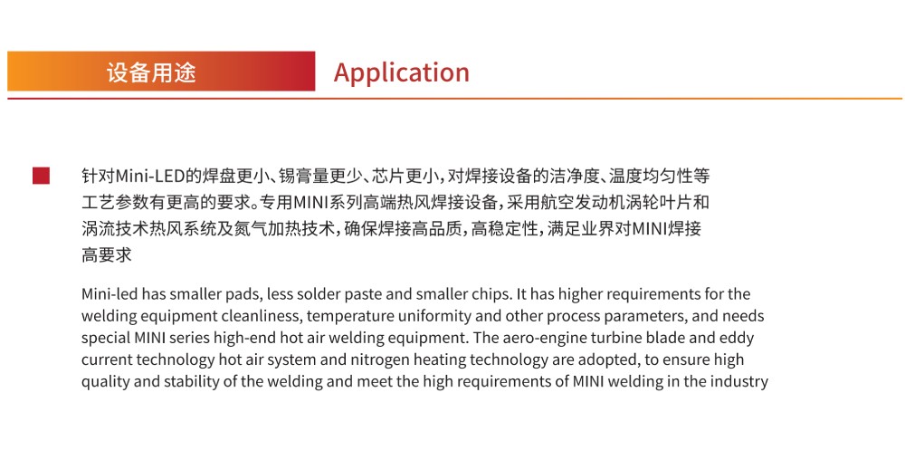 針對(duì)Mini-LED的焊盤更小、錫膏量更少、芯片更小,對(duì)焊接設(shè)備的潔凈度、溫度均勻性等工藝參數(shù)有更高的要求。專用MINI系列高端熱風(fēng)焊接設(shè)備,采用航空發(fā)動(dòng)機(jī)渦輪葉片和渦流技術(shù)熱風(fēng)系統(tǒng)及氮?dú)饧訜峒夹g(shù),確保焊接高品質(zhì),高穩(wěn)定性,滿足業(yè)界對(duì)MINI焊接的高要求。